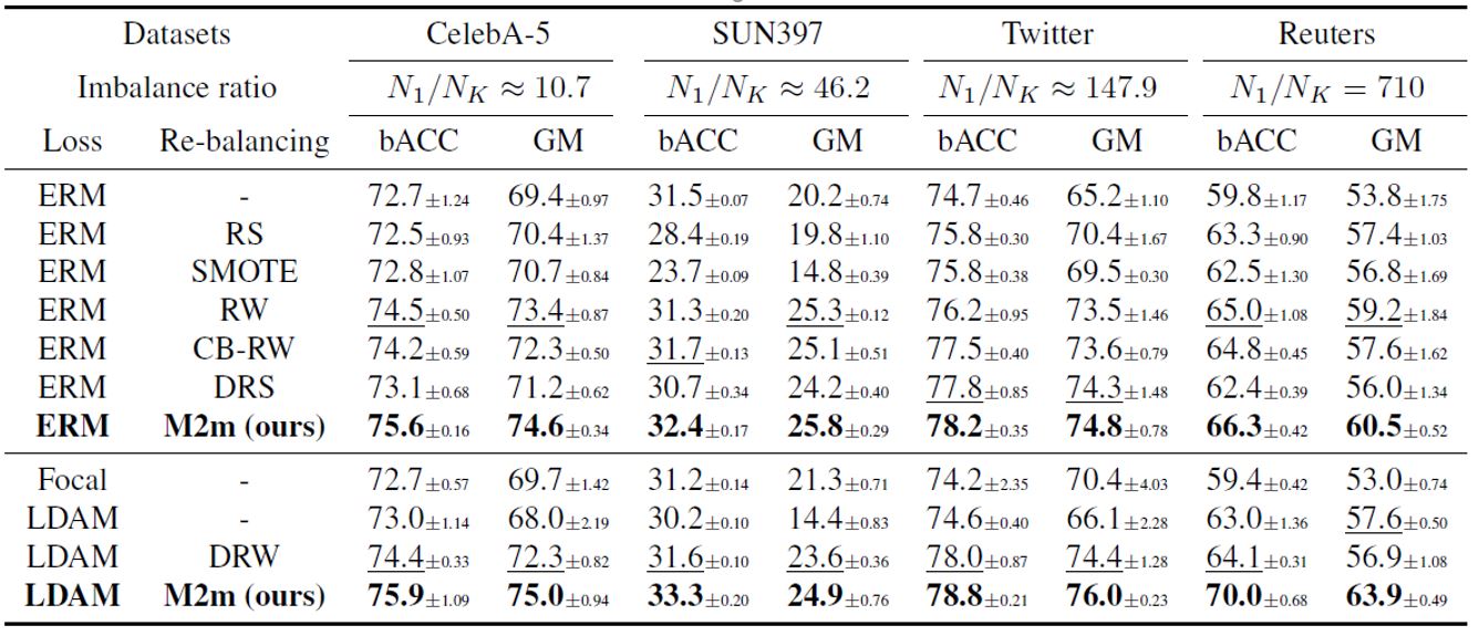 Kim, J., Jeong, J., & Shin, J. (2020). M2m: Imbalanced classification via major-to-minor translation. In Proceedings of the IEEE/CVF Conference on Computer Vision and Pattern Recognition (pp. 13896-13905).
