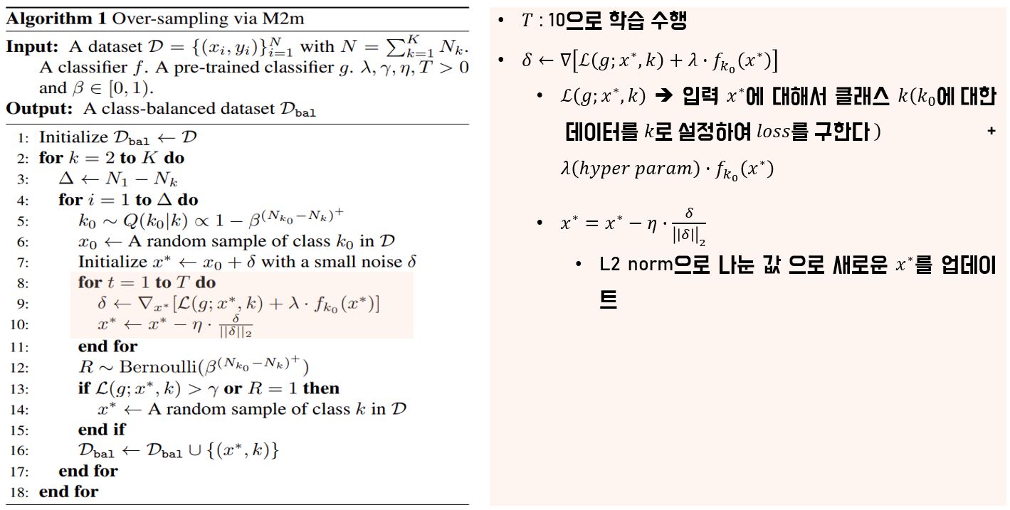 해당 방식을 보면 알 수 있듯이 일반적으로 모델이 학습 데이터에 대해서 기울기를 구한 후 해당 기울기 값을 활용하여 모델의 가중치를 업데이트하는데, 반대로 모델을 학습하는 것이 아닌 이미지를 minority class에 위치할 수 있도록(특징) 변화시켜주는 작업을 하는 것이 바로 M2m 방식이다. 만약 $T = 5$일 경우 위의 그림과 같이 5번의 변화를 통해서 기존 $x_0$가 $x^*$으로 변화하는 것을 표현할 수 있다.