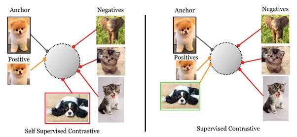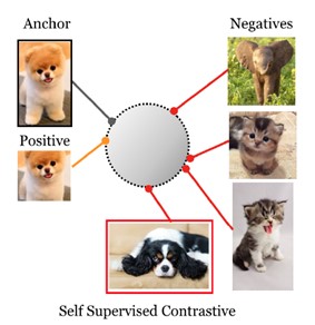 - 위의 그림을 보면 이해하기 쉽게, 같은 강아지라하더라도 빨간색 네모칸에 있는 강아지는 Anchor 이미지를 기준으로 다른 이미지이기 때문에 negative sample이고, positive의 경우에는 anchor를 기반으로 crop과 같은 data augmentation으로 생성된 이미지이기 때문에 같은 이미지로 만들어 졌기 때문에, positive sample로 판단한다.