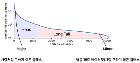 - 불균형은 쉽게 말하여, 데이터셋의 클래스 분포의 불균형으로 인해 발생하는 문제로 "Long-tailed"는 Major(가장 많은 수의 sample을 가지는 클래스)와 Minor(가장 적은 수의 sample을 가지는 클래스)와의 차이가 큰 문제를 말한다.