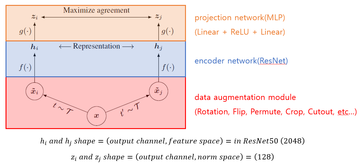 SimCLR의 전체적인 흐름은 위의 그림으로 모두 설명할 수 있다.