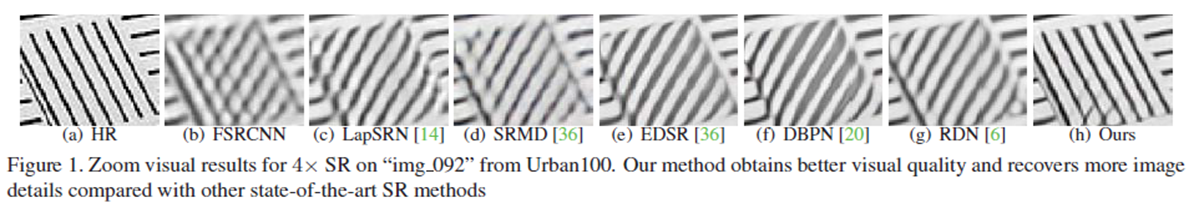 - 아래의 그림을 보면 알 수 있듯이, (h) 논문에서 제안하는 방법은 시각적 질이 보다 좋게 얻었음을 알 수 있고 다른 SOTA SR방법들과 비교하였을때 보다 상세하게 이미지를 복원한다.