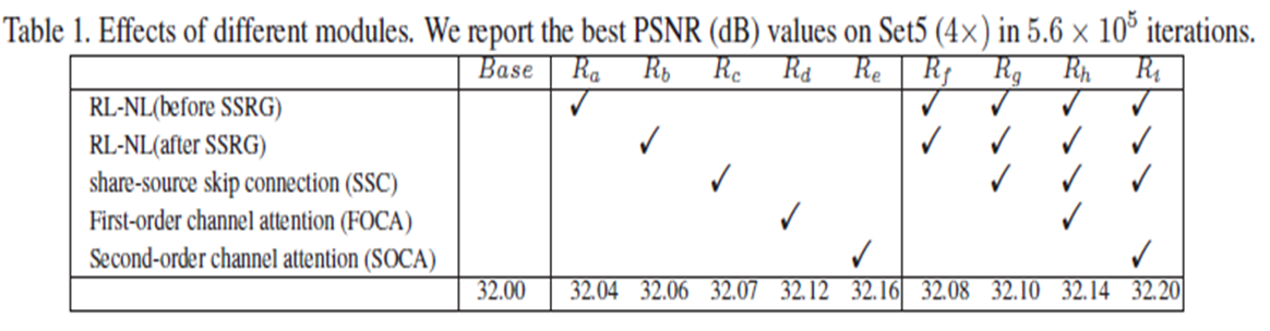 - 특히 얕은 (SSRG 이전) 또는 깊은 계층 (SSRG 이후)에 단일 RL-NL을 추가하는 $R_a,R_b$는 유사한 SR 결과를 얻고 Base를 능가하며 RL-NL의 효과를 검증한다.