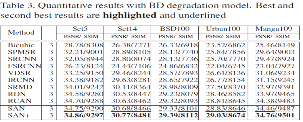 - BI 및 BD 저하 모델을 사용한 SR에 대한 광범위한 실험은 정량적 및 시각적 결과 측면에서 SAN의 효과를 보여준다.